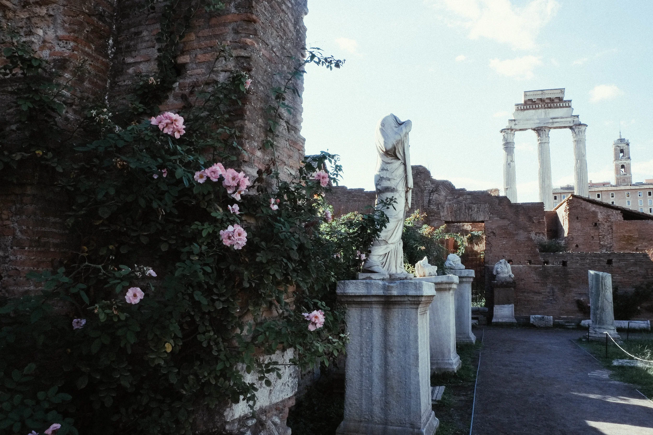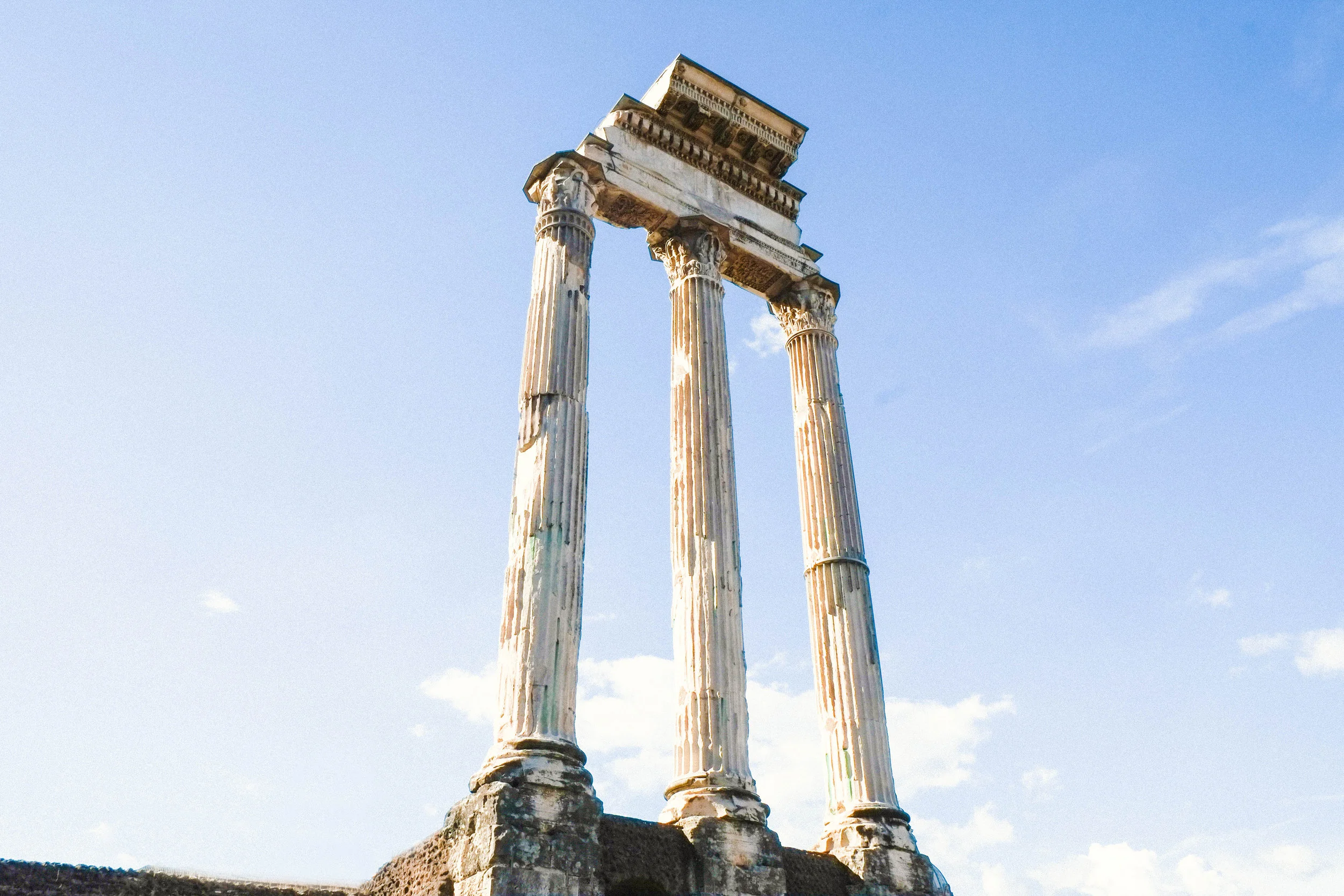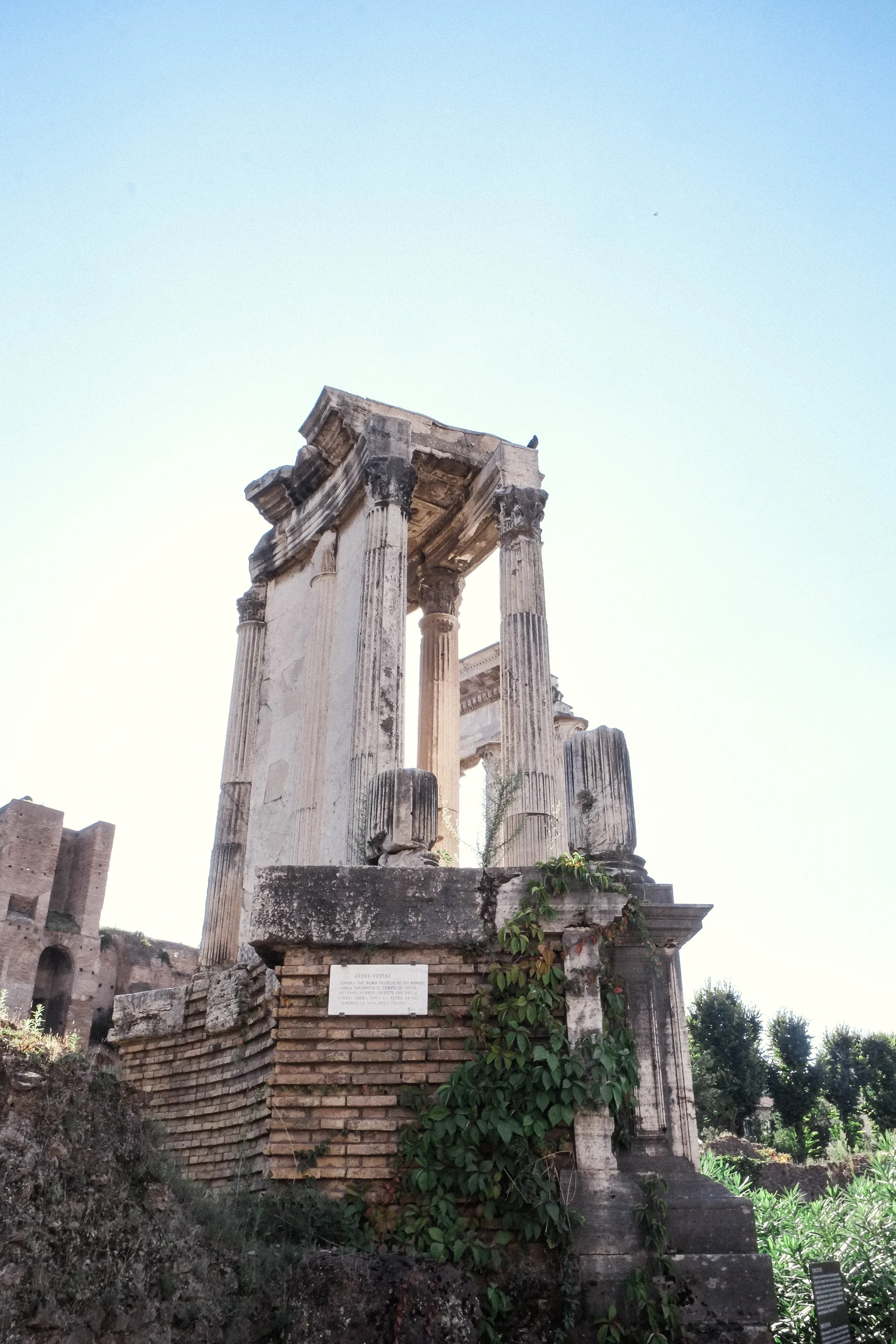 What is possibly the most recognisable of the ruins in the Forum is the remains of the Temple of Castor and Pollux, the twin sons of Zeus or Jupiter (this is both Greek and Roman mythology). While a temple, it is now just three Corinthian columns standing tall. The Temple of Antoninus and Faustina on the other hand has been extraordinarily preserved. It is also one of the first temples you see/notice when you make your way to the site. During the medieval Ages, the temple was converted to a church. Another curious façade of this temple is a green door amidst the Corinthian columns.